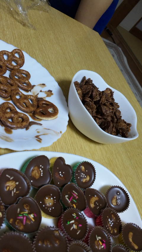 今日は休みだったので、ふらっと出かけて、ミックスナッツやらプレッツェルやら買ってきて、午後はひたすらチョコレートを増産してた。
