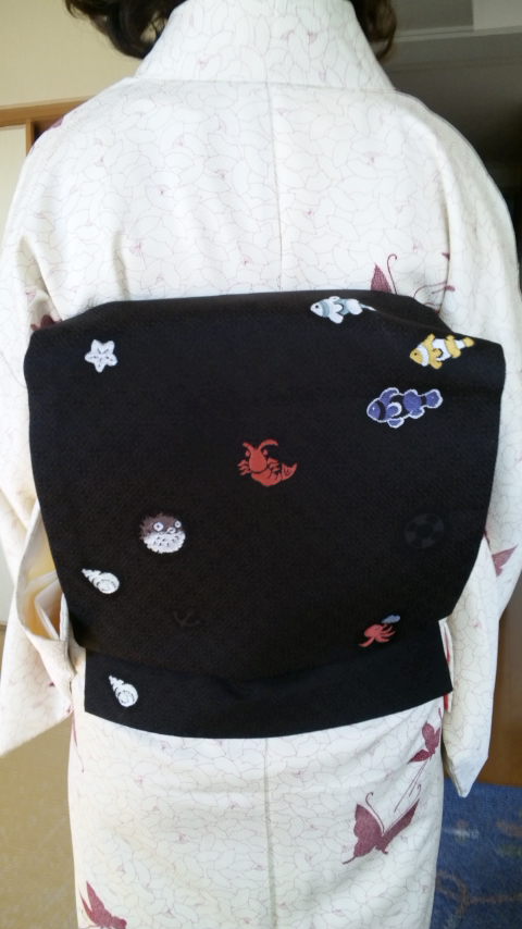 蝶々シルエットの着物に、海産物柄の帯。