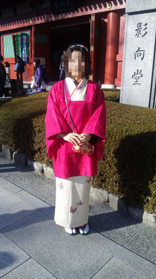 今日の着物は紅色とドピンクで。