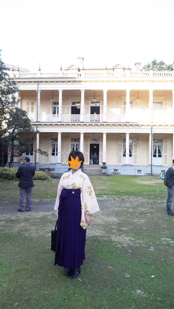 ちなみに今日のスタイルは、歩きやすい女袴、庭園から洋館を背景に。