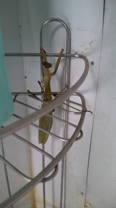 去年の秋から風呂場のラックにくっついたまんまのカマキリ。